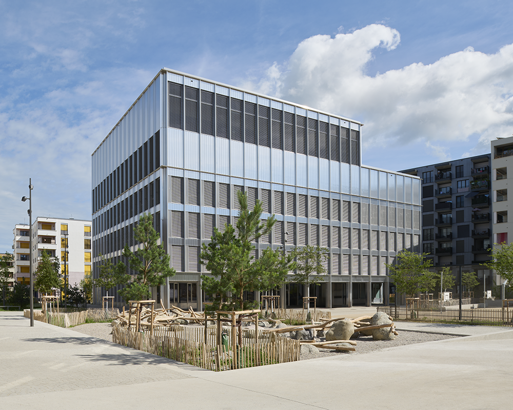 - la nouvelle Ecole primaire des Plaines du Loup, avec sa salle de gymnastique au dernier étage permettant de limiter les volumes en sous-sol, ainsi qu’une structure porteuse exploitant les points forts respectifs du béton, du bois et de l’acier. Un bâtiment multi-usage (éducation, culture, sport, santé), à disposition des habitants du quartier.